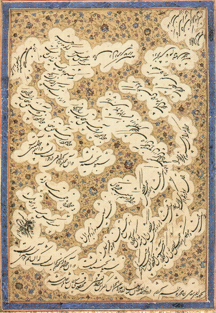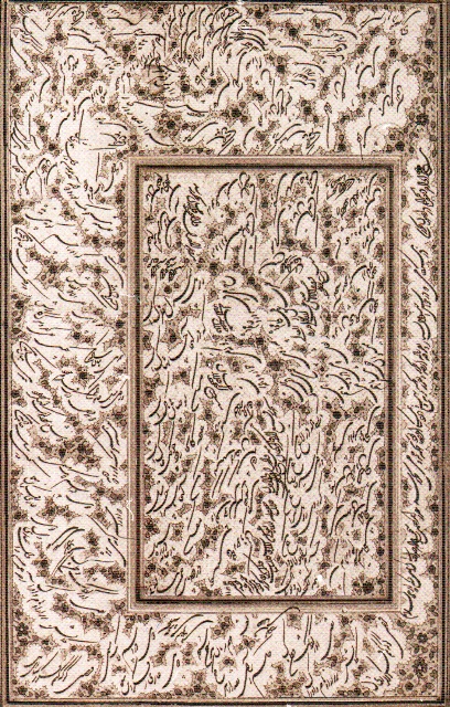 In addition, he popularized Shekasteh calligraphy in siyah-mashq (densely filled) form. His siyah-mashq works are mostly combinations of jali (bold) and khafi (thin) scripts. Even the pieces he wrote in horizontal notebook format display a strong and cohesive composition.