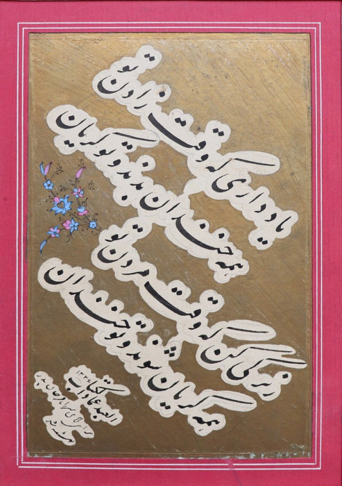 c) Individual pieces and documents: Calligraphic panels,siah-mashq(practice sheets), letters, official decrees, and paintings, many created during his imprisonment for collaborating with the Committee of Punishment.