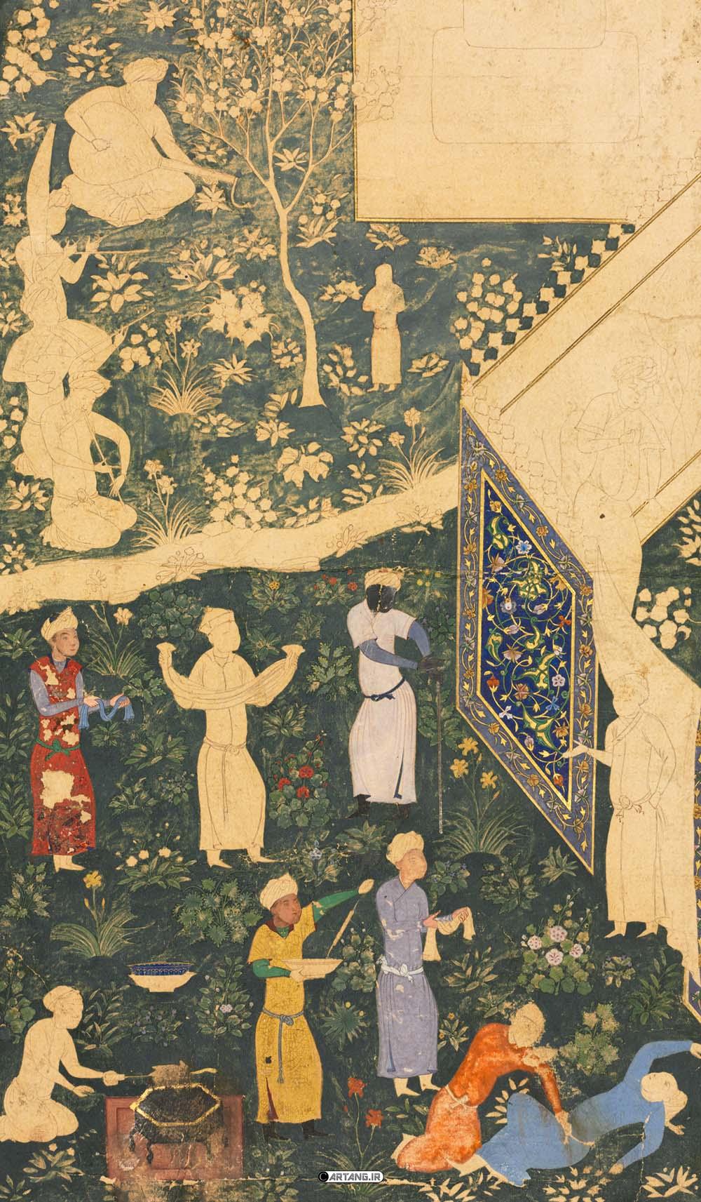 Furthermore, Behzad worked to diminish the influence of Chinese painting on Iranian art, bringing human depictions closer to Iranian physiognomy. Few painters in the history of Iran exhibited such ingenuity and innovation, influencing Iranian miniature painting for nearly eighty years. As a result, the Herat school reached its peak, and Behzad’s works and ideas became widely admired, forming a cultural and artistic model for future generations of painters.