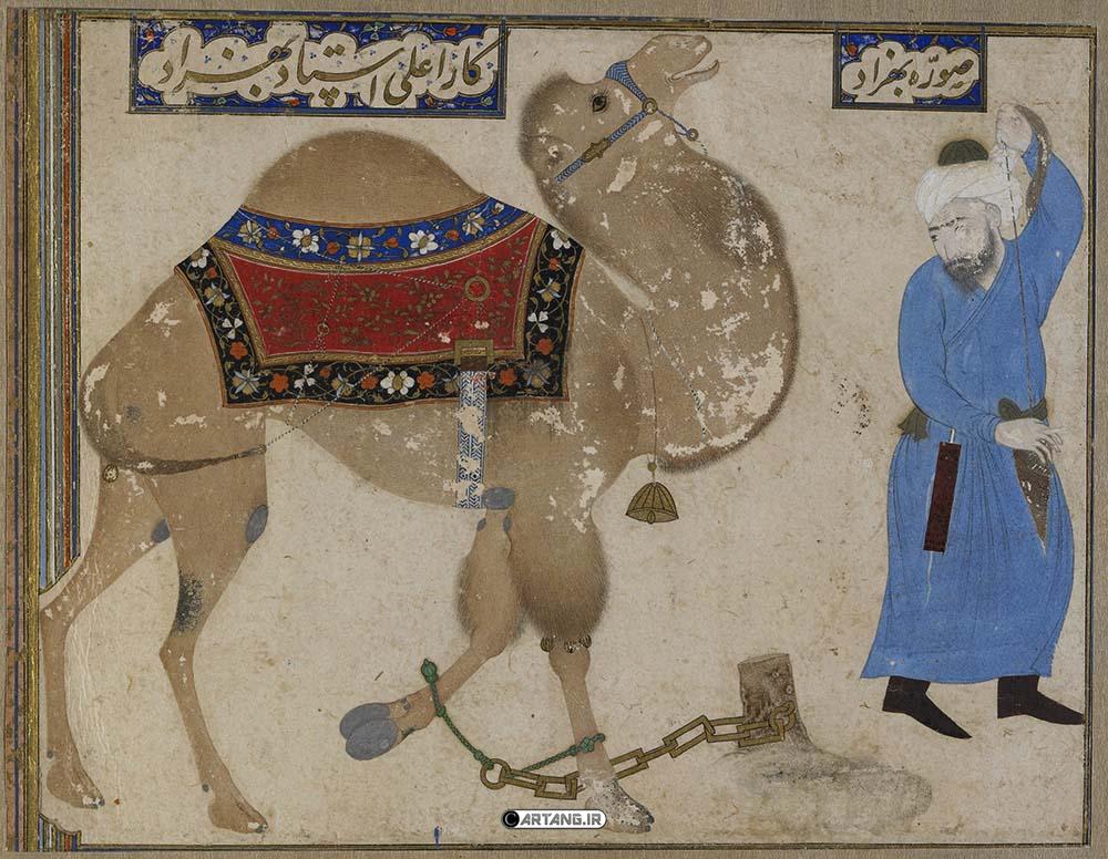 Behzad abolished the previously dominant Tabriz and Baghdad schools and established a new style in Persian miniature painting. He is among the rare artists of his time who incorporated ordinary people—servants, passersby, the poor—into his compositions. In Behzad’s art, the human figure plays the central role, and the creative development of his work stems primarily from his unique approach to depicting humans. He sought new techniques to show humans in emotion emphasizing contours, gestures, and realistic proportions of the body. In Behzad’s paintings, nature is not merely a background, it serves as the environment in which the story’s heroes exist. Figures in his works maintain organic relationships with each other, each possessing distinct characteristics, with their positions within the composition carefully pre-determined. Even in tightly packed miniature scenes, sufficient space is left for buildings, gardens, springs, and mountains. Maintaining proportion among these elements relies on geometric methods, which Behzad applied both to the overall composition and the placement of figures. His paintings are notable for their strong, precise compositions, logical and organized depiction of architecture, and the inclusion of diverse characters that demonstrate social interaction. Through these techniques, Behzad successfully introduced movement and dynamism into Persian miniature painting. His works are well-divided and structured, often including a figure acting as an observer or controller, reflecting Behzad’s belief in oversight of actions. For example, in his illustrations of the Zafarnameh, Timur is depicted supervising his soldiers. Behzad’s works consistently emphasize piety, ethics, and humanity. He showed particular attention to Qur’anic verses, contemplating their meaning and integrating them into his art. An example is his depiction of the verse “Do they not observe the camels, how they are created?” in miniatures like The Battle of the Camel Riders or The Camel and Its Owner, demonstrating his faith and devotion.