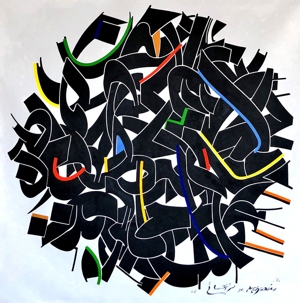 Ehsai’s entry into the circle of painters and graphic artists took place in the early 1960s at the Pars Institute, where he became acquainted with the new environment and the field of modern art. Yet, although Ehsai created modern works, his mindset never became modern in the strict sense of the term. This marks one of the key distinctions between him and certain other Iranian modernists. Ehsai was a spiritual seeker, consistently bound to meaning — but a meaning rooted in traditional spirituality, not the abstract mysticism that preoccupied theorists of abstract art. One of the most important aspects of Ehsai’s modern works — which should be evaluated within the context of Iranian modern painting — is the fluid presence of geometry, a strong and dynamic element that seems to keep Ehsai grounded as a calligrapher. The influence of classical calligraphy in his paintings can thus be interpreted from this perspective. The geometry in Ehsai’s works is alive and mobile, finding room to move within a firm structure. Even when painting, Ehsai remains a calligrapher experimenting with new experiences. His paintings should be understood as a continuation of his calligraphic consciousness, for he never breaks free from the dominance of letters and words. In some of his works, his technique approaches that of Chinese calligraphy. The letters in Ehsai’s art are not reduced to mere visual elements — they constitute the very essence of the work. Although his paintings make effective use of color and form to enhance expression and completeness — qualities worthy of contemplation in their own right — these are not the intrinsic elements of his art. Undoubtedly, Ehsai’s thoughtful use of color and form has played a vital role in giving his works a transcultural identity, making his artistic language more accessible to a global audience.