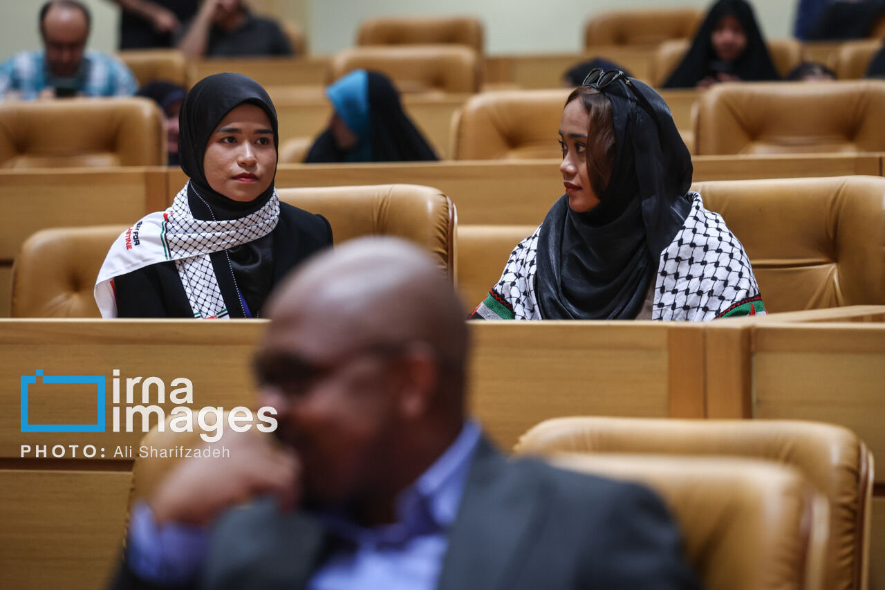 The international event features attendees from various countries, including Palestine, Iraq, Afghanistan, Pakistan, Lebanon, Turkey, Bangladesh, Tunisia, Serbia, Malaysia, and Zimbabwe, among others.