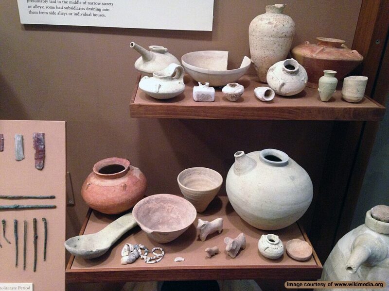 Among the most significant artifacts unearthed at the Choghamish Mounds are the ancient pottery vessels. One of the most remarkable pieces depicts a fisherman, a fish, and two wild predators, dating back to the 4th millennium BCE, around the beginning of the invention of writing. During this period, a distinct type of pottery known as “Lip-Fused Ware” (Leb-varikhteh) became widespread, many examples of which have been discovered at Choghamish. Some of these vessels bear astonishingly skillful painted motifs, so refined that it is hard to imagine such artistic mastery existing in that early era. In later periods, geometric patterns became more common, forming intricate designs when combined. Altogether, these findings testify to the advanced level of pottery-making and artistic sophistication that once flourished in this part of ancient Iran.