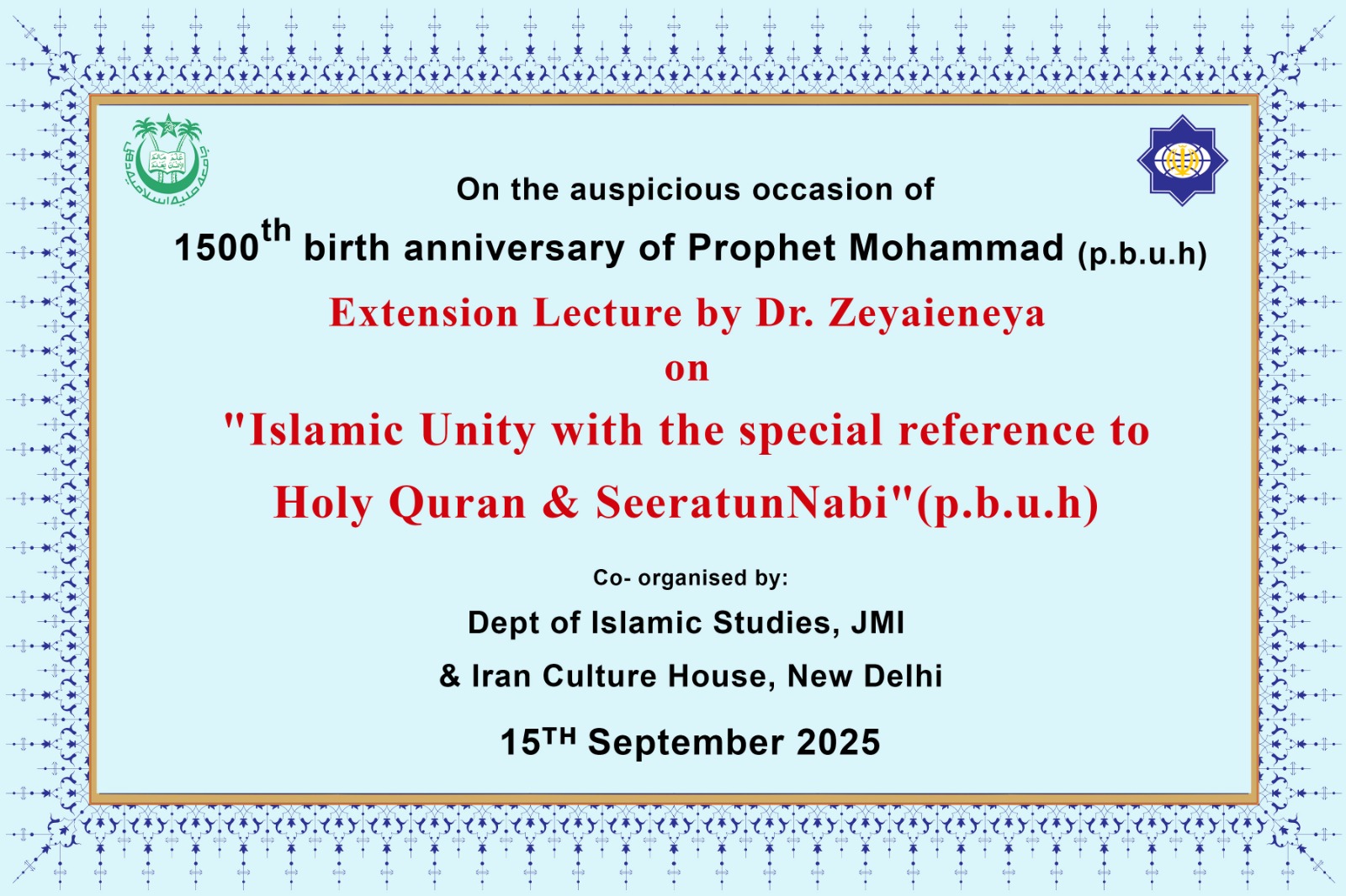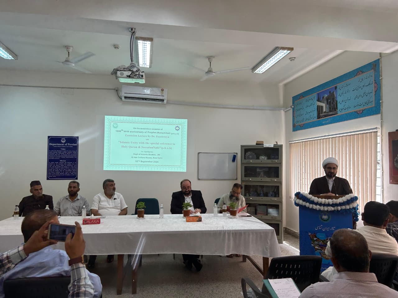 On September 15, 2025, a special academic event titled "Islamic Unity with especial reference to the Holy Quran and SeeratunNabi (p.b.u.h)" was held at the Iranology Hall of Jamia Millia Islamia, New Delhi, to commemorate the 1500th birth anniversary of Prophet Muhammad (PBUH). The event was organized jointly by the Culture House of the Islamic Republic of Iran in New Delhi and the Department of Islamic Studies, Faculty of Humanities, Jamia Millia Islamia.